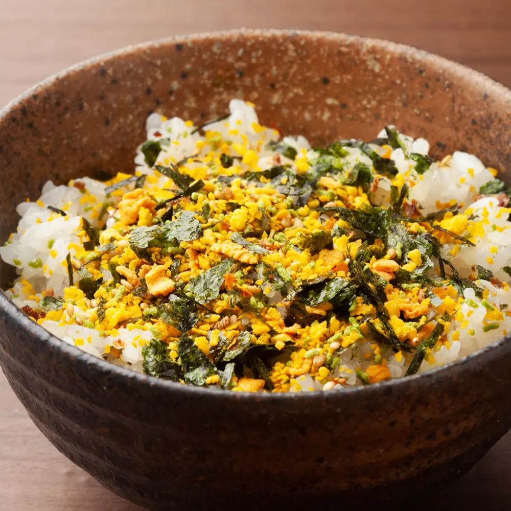 Japansk krydderblanding som kombinerer smakene av nori-tang og tamago-egg. Dette allsidige krydderet drysses vanligvis over ris, grønnsaker eller andre retter for å forbedre smaken med en velsmakende, umami-rik profil.